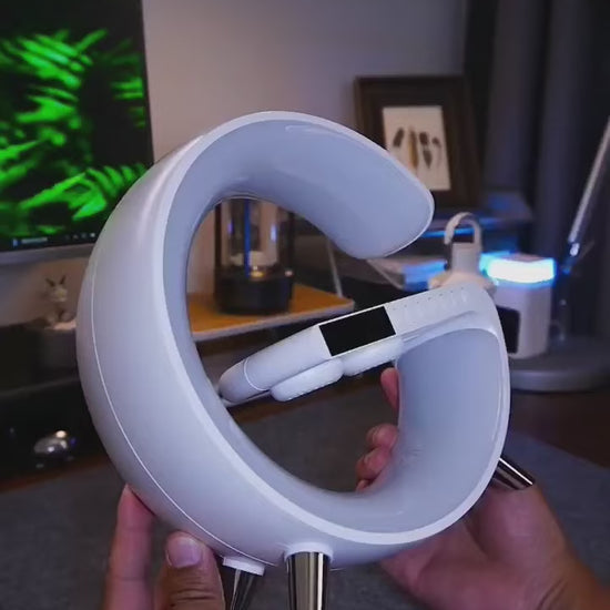 Stop juggling multiple gadgets and tangled wires. The G-Shape 4-in-1 Smart Lamp is the elegant solution to your clutter problem. We've combined four essential devices—a high-fidelity Bluetooth speaker, an LED lamp with customizable colors, a built-in FM radio, and a 15W fast wireless charger—into one stylish, space-saving design.